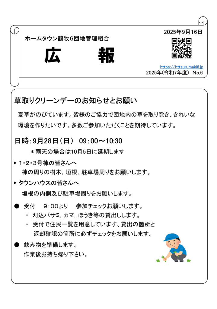 9/28(日)9:00~10:30 草取りクリーンデーの作業を行います。団地内環境美化にご協力をお願いします。