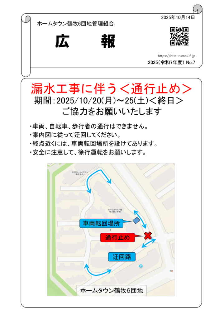 漏水工事に伴い、団地内周回路が一部通行止めとなります。下記の期間は迂回をお願いします。