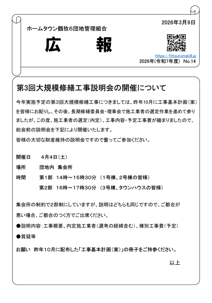 今年実施予定の大規模修繕工事の説明会を開催しますのでご参加ください。