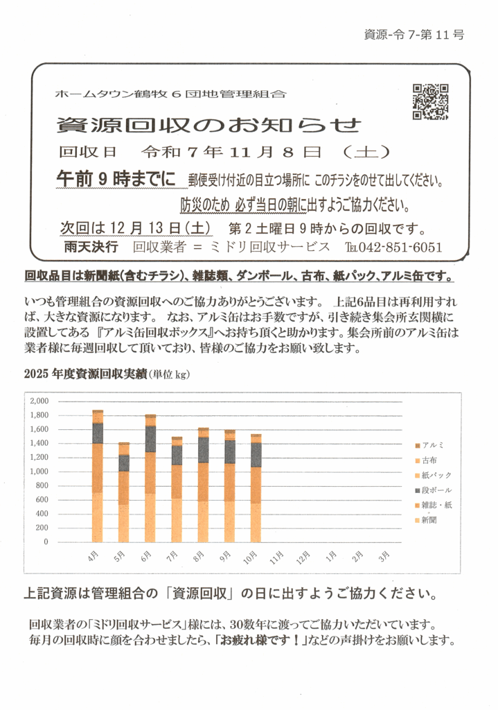 11月8日(土)9時より資源回収を行います。